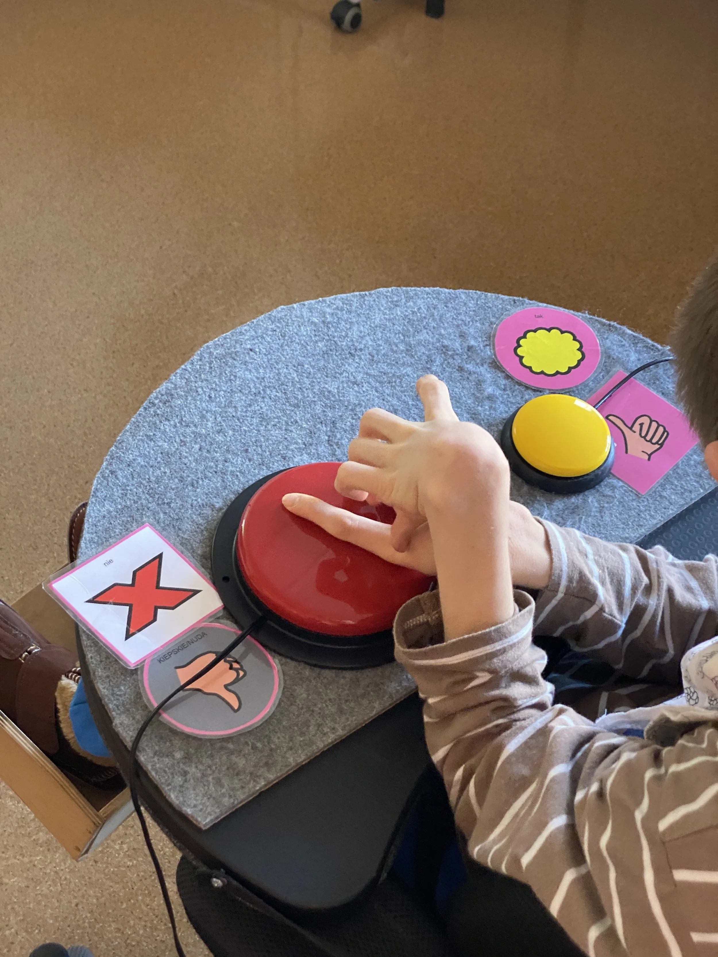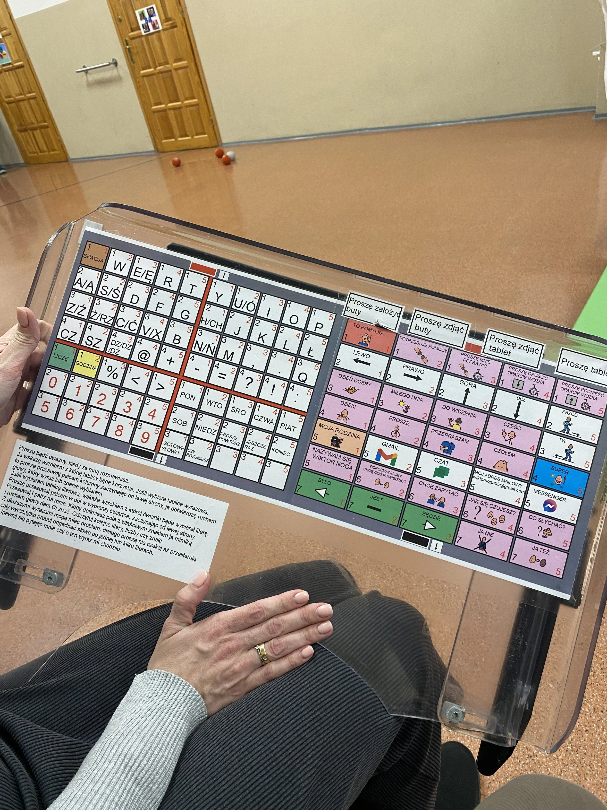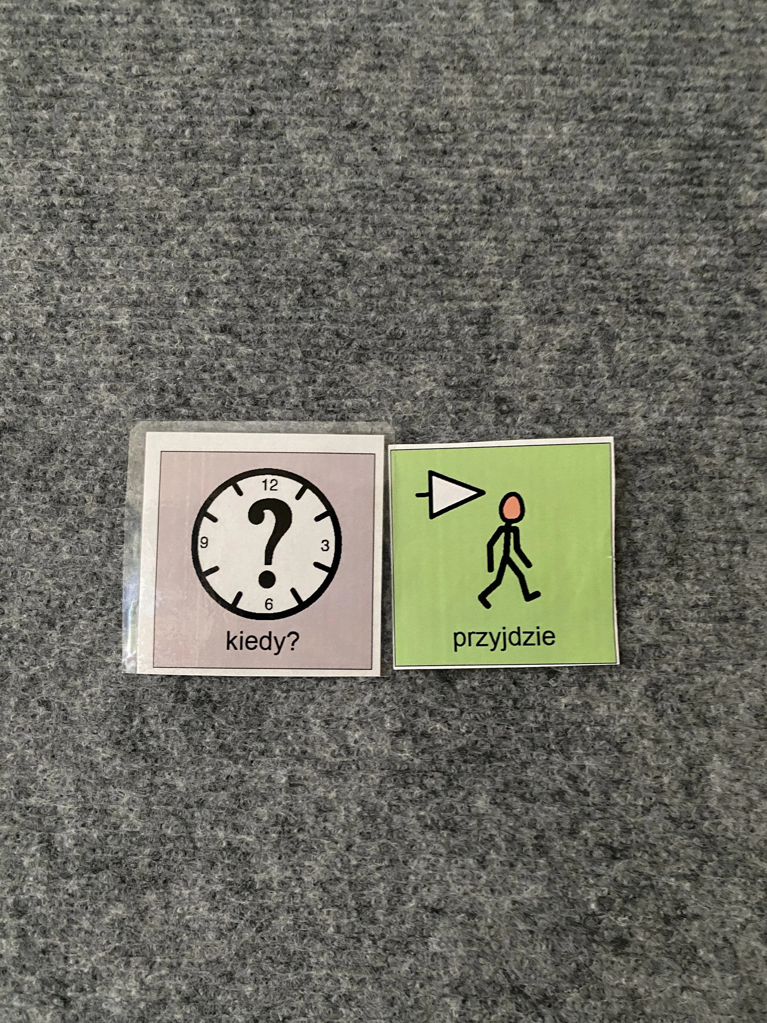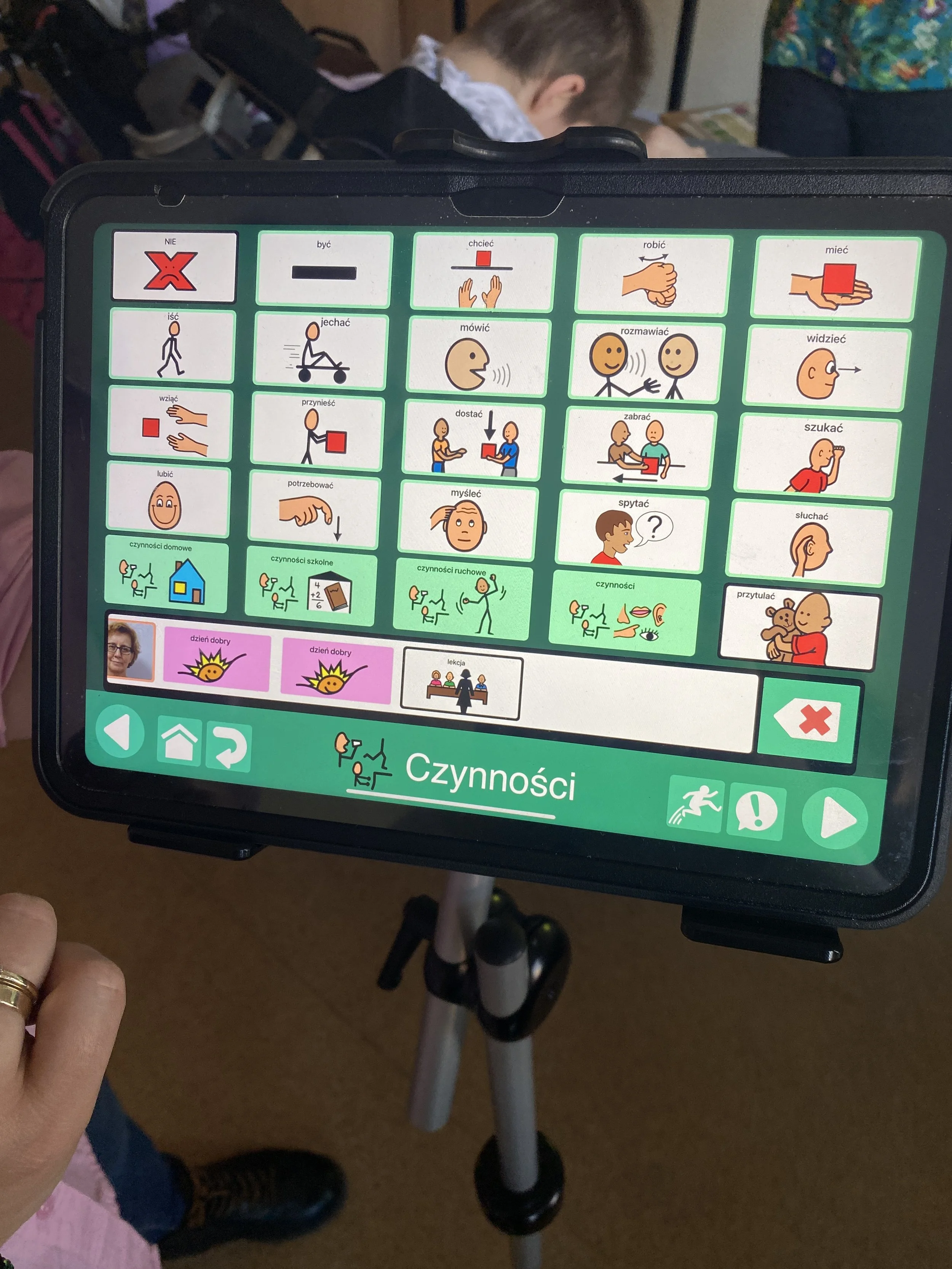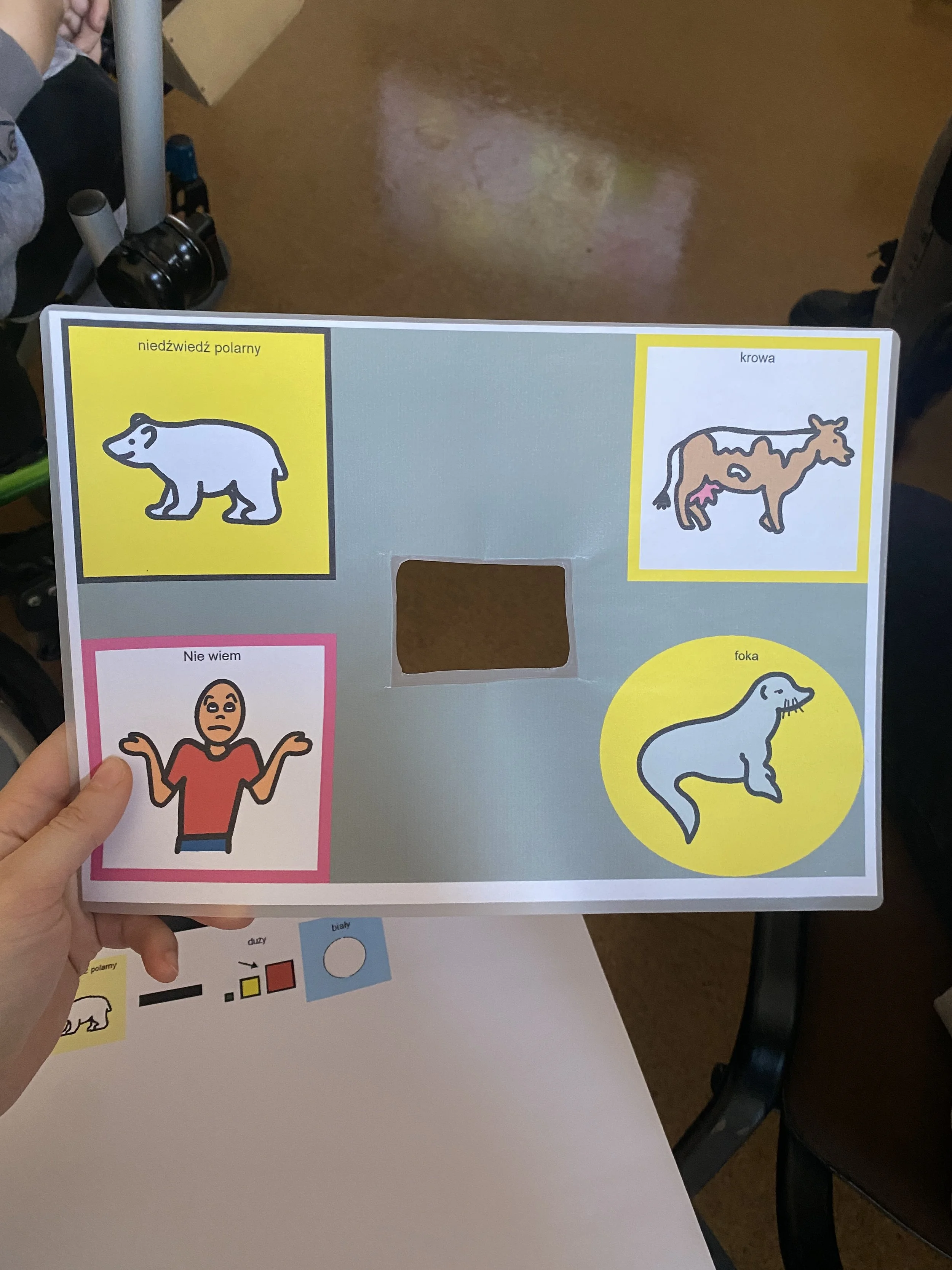 Для дітей попередньо створили можливість відповідати на ці питання. Марися відповідає лише картками «так» і «ні» на своєму кріслі колісному. Антоніо має картки, приклеєні до крісла та кнопки, які озвучують «так» і «ні», а також, аркуш з віконечком, де поглядом обирає те, що хоче сказати. Яцик має планшет, де обирає картки і вони озвучуються. В кінці уроку відбувається невеликий іспит.