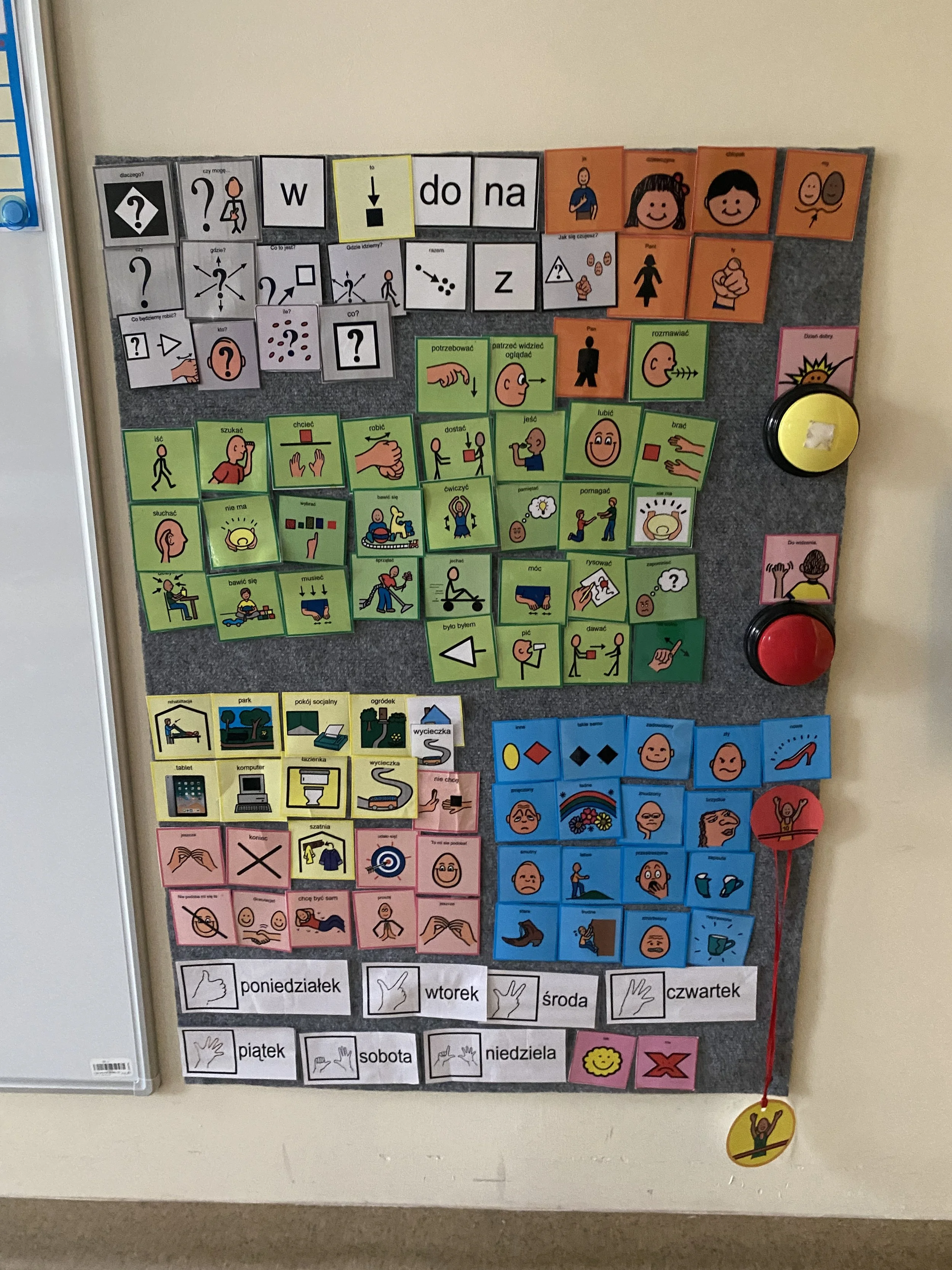 Також, в класах розміщені піктограми, комунікативні кнопки, книги, пристрої з озвученням, планшети, сенсорні екрани тощо. Школа робить все для того, щоб кожен учень міг спілкуватись. У школі все супроводжується символами. Ще з вулиці на дверях є символьні зображення. Також вони є в коридорах та класах. На стінах закріплені дошки з спеціальним покриттям, щоб до нього клеїти символи. Також там прикріплені дві комунікаційні кнопки. Одна озвучує «Добрий день», а інша «До побачення», що дозволяє кожній дитині привітатись з вчителем та однокласниками вголос.